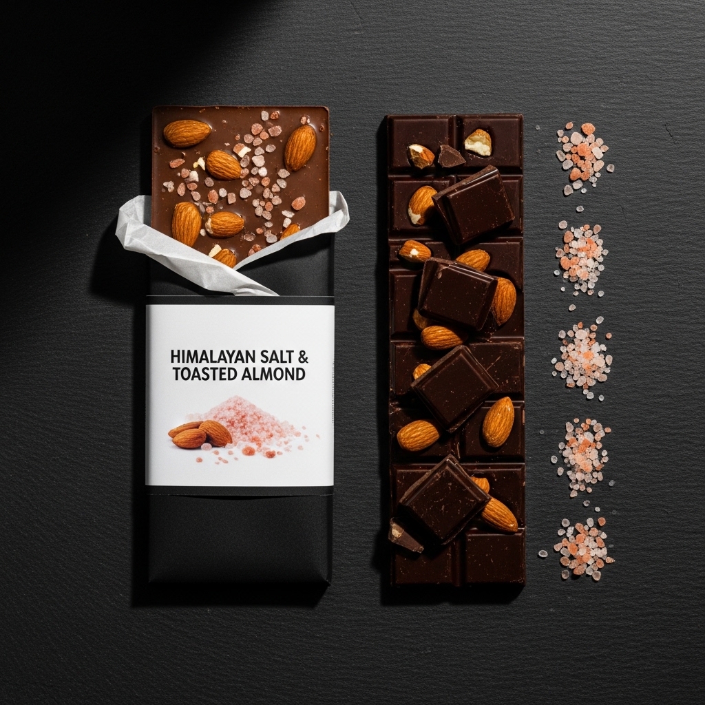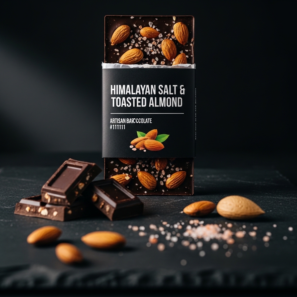 This single-origin Venezuelan dark chocolate bar features stone-ground 68% cacao embedded with hand-roasted Marcona almonds and delicate flakes of Himalayan pink salt. Each bar is aged for two weeks following production, allowing the flavors to settle and deepen before reaching your table. The first bite reveals caramelized almond richness against the deep, fruit-forward notes of Venezuelan cacao, punctuated by bright mineral crystals that dissolve slowly on the tongue. The texture balances smooth chocolate with crunchy almond pieces and the occasional satisfying crunch of salt. The bar arrives in matte black wrapping with minimalist typography, stored in a protective sleeve. Each piece is hand-broken along natural fault lines, preserving the rustic character of small-batch chocolate work.